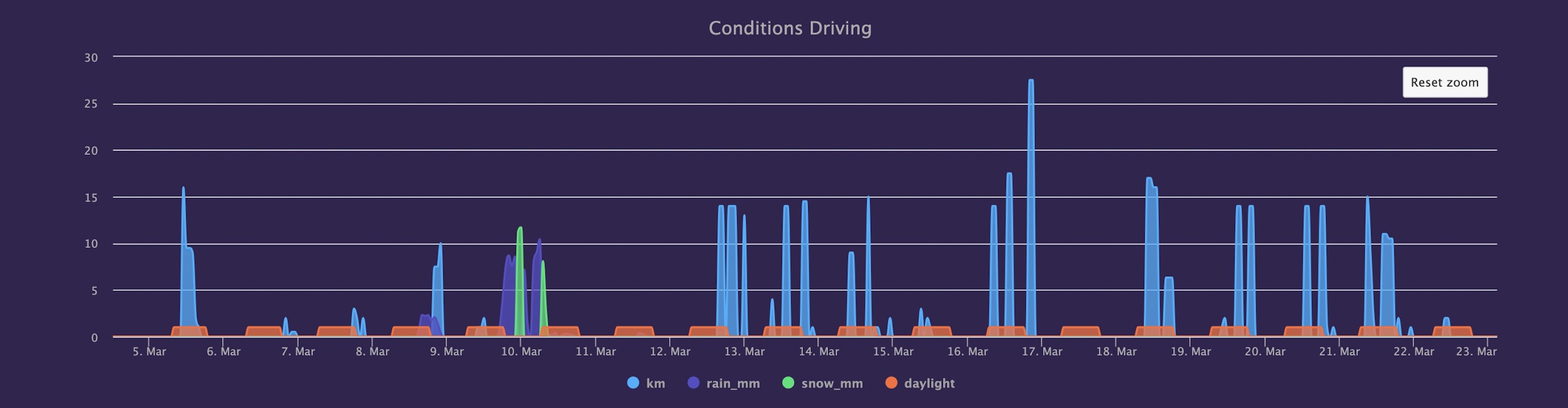 Secunite provides data relating to mileage (per hour, per day), data relating to driving periods (% of driving during the day, at night, at sunrise, at sunset), driving conditions (% of driving in rain, snow or fog).